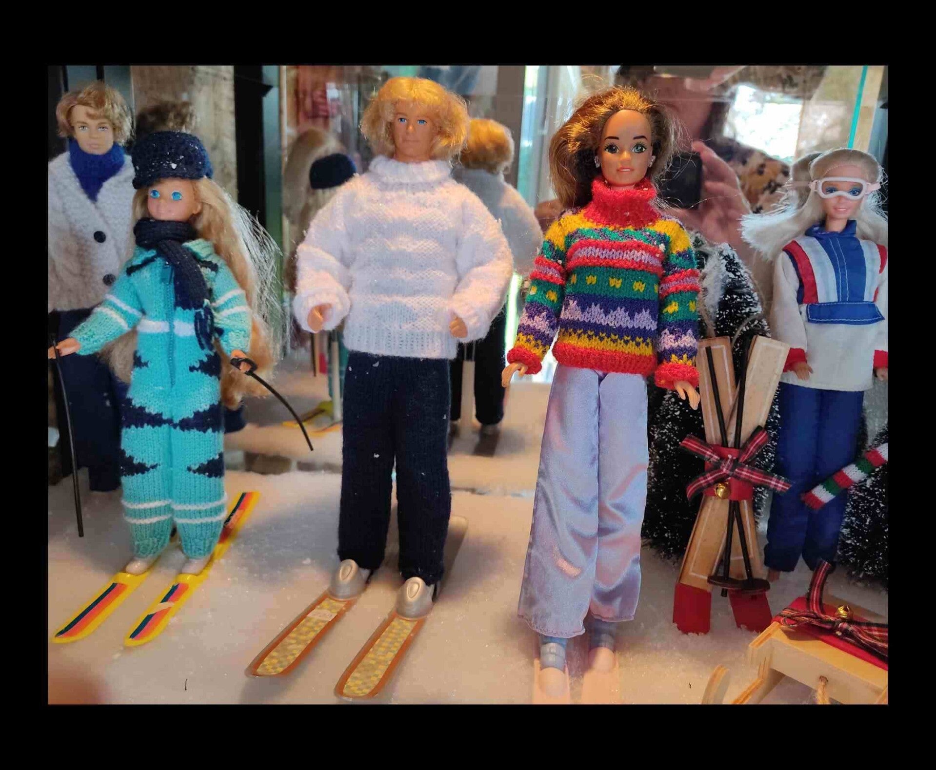Allerlei settings voor de Barbies, hier een sneeuwlandschapje met poppen op de lange latten.